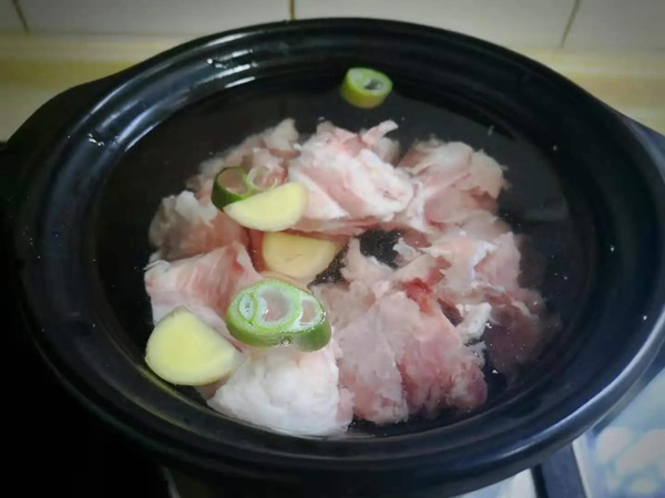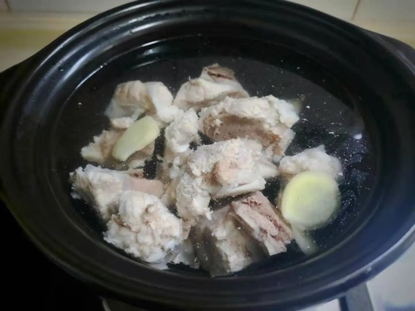 Bước 2: Xương sau khi rửa sạch thì cho vào nồi nước lạnh, thêm ít gốc hành lá và gừng thái lát vào. Bật bếp và đun sôi, chần xương trong khoảng 2 phút thì vớt ra, rửa sạch với nước. Sau đó bạn cho xương vào nồi, thêm lượng nước vừa đủ. Tiếp đó thêm vài lát gừng, 1 thìa canh rượu nấu ăn vào, đun sôi ở lửa lớn rồi giảm lửa nhỏ liu riu để hầm xương.