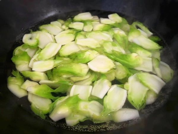 Bước 1: Sơ chế sạch rau mầm đá rồi cho vào nước muối nhạt, ngâm và rửa sạch nhiều lần để tránh tạp chất ẩn bên trong lá. Sau đó cắt rau thành những lát mỏng vừa phải. Bạn lưu ý không nên cắt mỏng rau quá vì sẽ khiến rau mềm, không giữ được kết cấu giòn. Đặt một nồi nước lên bếp, đun sôi rồi cho chút muối và vài giọt dầu ăn vào. Sau đó thả rau mầm đá vào chần trong khoảng 2 phút thì vớt ra, để ráo.