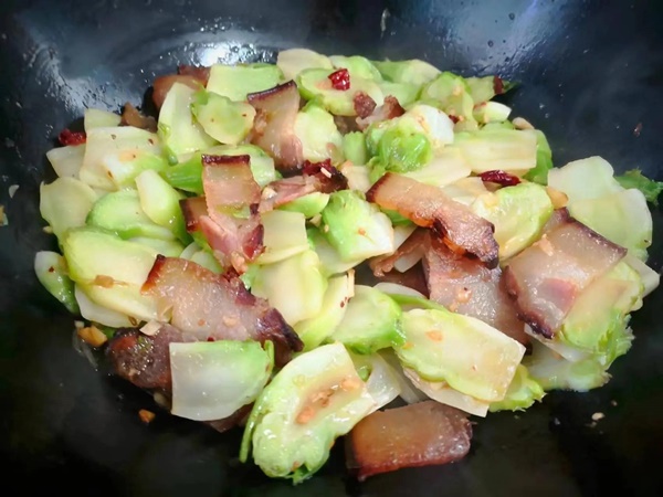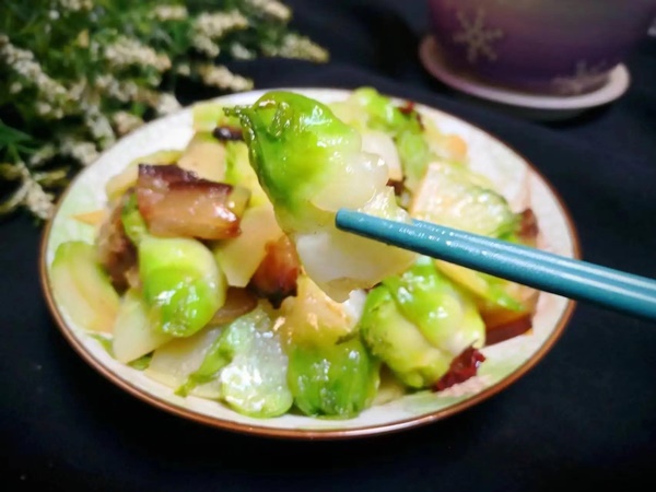 Thành phẩm món thịt xông khói xào rau mầm đá