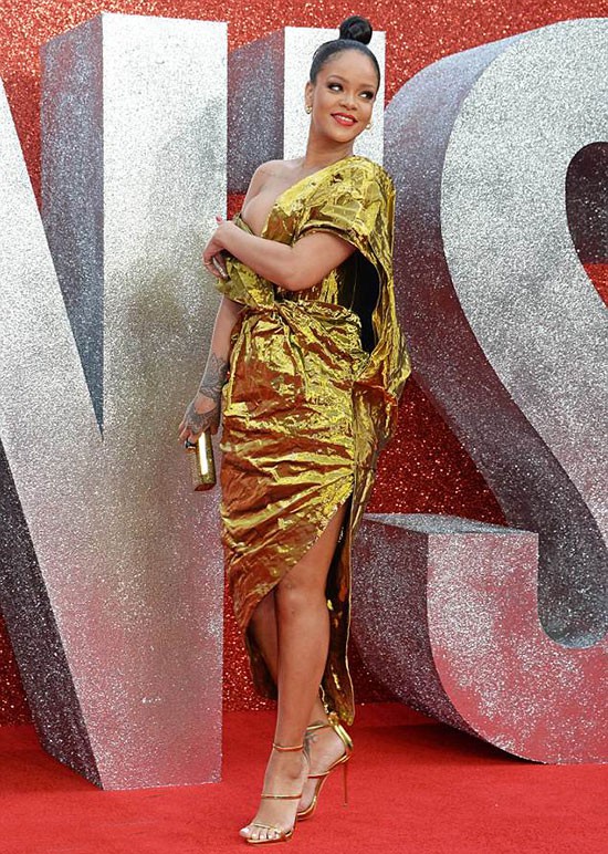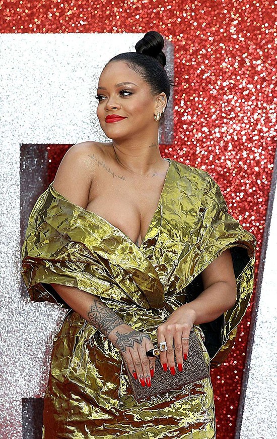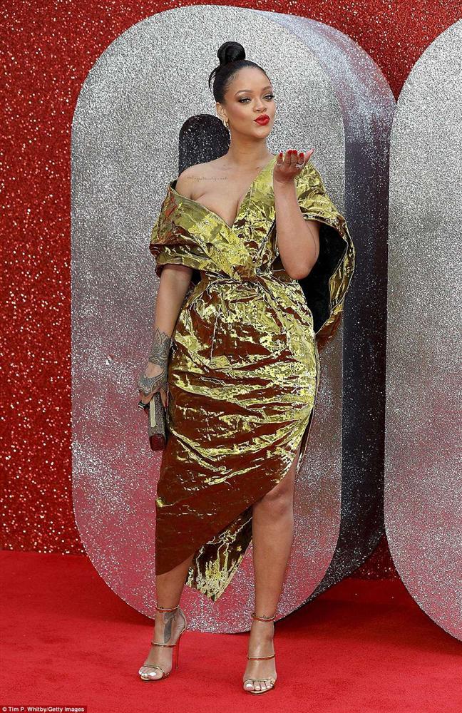 Chiều tối 13/6, dàn sao phim "Ocean's 8" đã cùng quy tụ trong sự kiện công chiếu phim tại London. Rihanna đến trễ hơn các bạn diễn khác, nhưng vẫn thu hút nhiều sự chú ý với trang phục gợi cảm. Nữ ca sĩ diện hẳn một bộ váy ánh vàng trễ nải khoe vòng 1 đẫy đà, suýt nữa thì hớ hênh cả nhũ hoa trước nhiều ống kính.