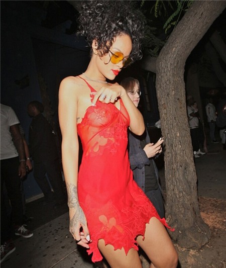 Nữ ca sĩ “Umbrella” thản nhiên xuống phố với bộ váy đỏ ren siêu mỏng. Nhiều người sửng sốt tự hỏi không biết cô có mặc nhầm áo ngủ hay không?