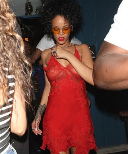 Mặc dù là buổi tối nhưng vòng một lấp ló ẩn hiện không nội y của Rihanna cũng được “tố cáo” rõ ràng sau lớp áo mỏng. Thế nhưng cô nàng hoàn toàn tự nhiên phớt lờ mọi ánh nhìn cũng như ống kính máy ảnh của cánh papazazzi. Thỉnh thoảng cô còn vô tư đưa tay lên kéo áo như chỗ không người.