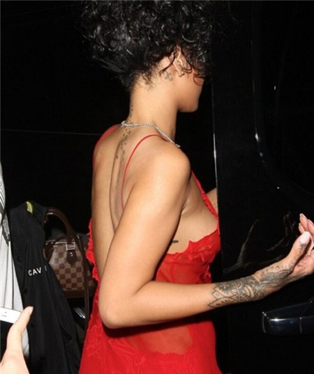 Ở nhiều góc chụp các fan dễ dàng nhận thấy nhiều hình xăm sau lưng cũng như cánh tay của Rihanna. Đặc biệt lớp áo mỏng cũng không che khuất được hình xăm một ngôi sao nhỏ được khổ chủ xăm ngay trên bầu ngực.