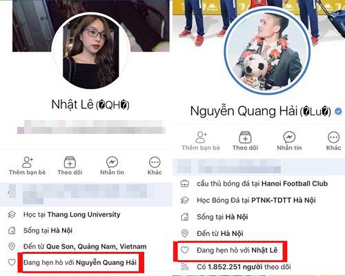 Đầu tiên đó chính là việc cả Quang Hải và Nhật Lê đã không còn để trạng thái "Đã hẹn hò" với nhau như trước đây nữa. Đồng thời, quan sát trên trang cá nhân của cặp đôi này thì nhiều người phát hiện, đã từ rất lâu rồi cả hai không còn tương tác với nhau dù trước đây, mỗi lần Nhật Lê đăng ảnh hay status là Quang Hải lập tức "thả tim", bình luận ngay. Lần cuối cùng Quang Hải tương tác trên Facebook của Nhật Lê là cách đây 7 tuần.