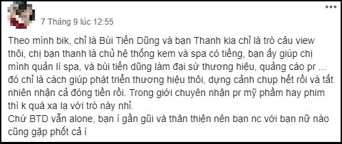 "Theo mình biết, Bùi Tiến Dũng và bạn Thanh kia không phải yêu nhau thật. Chị của Thanh là chủ một hệ thống spa có tiếng và bạn ấy giúp chị của mình quản lý nó.