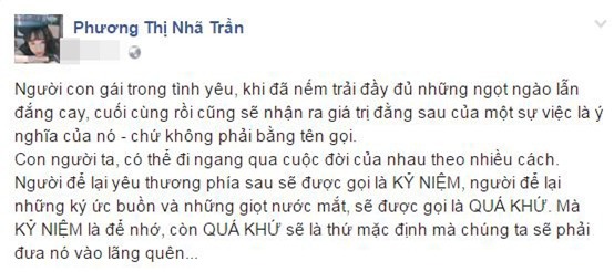 Trên trang cá nhân, Nhã Phương chia sẻ: "Người con gái trong tình yêu, khi đã nếm trải đầy đủ những ngọt ngào lẫn đắng cay, cuối cùng rồi cũng sẽ nhận ra giá trị đằng sau của một sự việc là ý nghĩa của nó – chứ không phải bằng tên gọi.