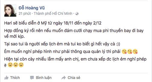 Cụ thể, trên trang cá nhân của quản lý Hari Won có viết: “Hari sẽ biểu diễn ở Mỹ từ ngày 18/11 đến ngày 2/12. Hợp đồng ký rồi nên nếu muốn đám cưới chạy mua phi thuyền bay đi bay về mới kịp. Tại sao tui là người xếp lịch ẻm mà tui ko biết gì hết vậy cà. Ẻm muốn nghỉ phép hình như phải thông qua quản lý thì phải. Năm nay còn cày nhiều lắm mấy anh chị, em chưa xếp được lịch ẻm nghỉ phép.”