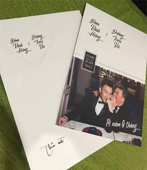 Sáng sớm 9/5, nhiều khán giả đã rất bất ngờ khi trên mạng bỗng xuất hiện những tấm thiệp mời của Đàm Vĩnh Hưng, Dương Triệu Vũ. Trên thiệp ghi rõ: “Đàm Vĩnh Hưng & Dương Triệu Vũ: 14 năm 9 tháng”, được lồng thêm đường viền trái tim và hình ảnh của cả hai rất lãng mạn.