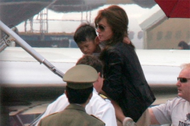 | Angelina Jolie bế Pax Thiên lên máy bay sau khi nhận nuôi cậu bé |