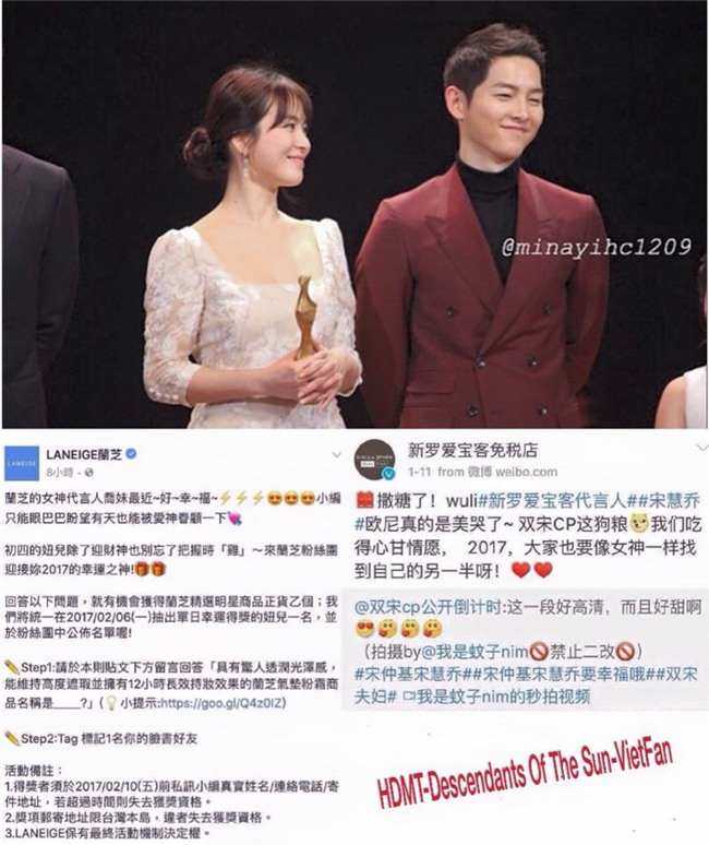 Theo Laneige Đài Loan chia sẻ trên mạng xã hội cá nhân đã chỉ đích danh việc Song Hye Kyo và bạn trai gần đây đã xác nhận về ngày cưới, tâm trạng hiện nay vô cùng hạnh phúc. Trong khi đó Shilla Duty Free lại chia sẻ thông tin: "Song Hye Kyo quả thực vô cùng xinh đẹp, chúng ta sắp được ăn kẹo cưới rồi, hi vọng trong năm 2017 tất cả các bạn cũng sẽ tìm được một nửa của đời mình giống như nữ thần của chúng ta vậy".