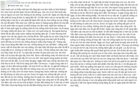 Người ta được ở cữ 3 tháng 10 ngày, còn bạn thì làm hết mọi việc, con chưa đầy tháng đã phải gửi để đi làm. "Về nhà rồi thì tự nấu ăn, tự giặt đồ chẳng có ai phụ cho. Bữa nào nhớ đến thì chồng mua cho cục thịt kho mà ăn còn không có thì nấu cơm rồi chan nước tương hay nước mắm ăn. Không ăn thì đói không có sữa cho con bú. Được 25 ngày mẹ chồng bắt gửi con đi làm để trả nợ cho chồng. Không chịu thì quậy em, đêm nào cũng chửi. 29 ngày đứt ruột đem con đi gửi để đi làm. Ngày nào cũng làm từ 8h sáng đến 12h đêm vậy mà còn bị chửi bị đánh. Đi làm đến tháng thứ 3 hôm ấy có 80.000. Tiền điện chưa kịp đóng mà bà cắt điện không cho em xài".
