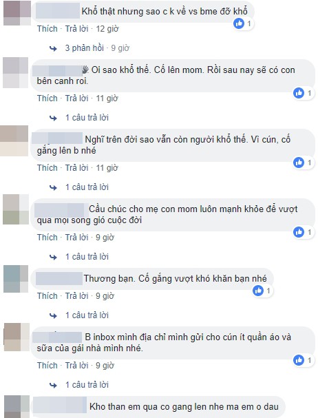 Một mẹ đơn thân khác là chủ nhân của facebook O.K động viên: "Mình cũng chả giúp gì được. Chỉ mong mẹ con bạn luôn mạnh khỏe. Mình cũng chuẩn bị làm mẹ đơn thân, cũng khổ lắm nhưng không khổ nhiều như bạn. Cố gắng nhé".
