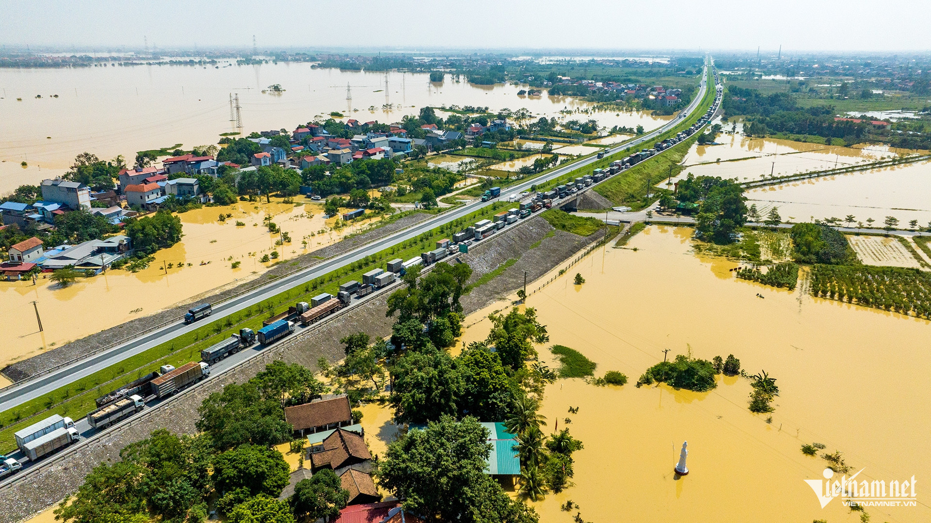 Khung cảnh khu dân cư hai bên cao tốc trưa 10/10 vẫn chìm trong biển nước.