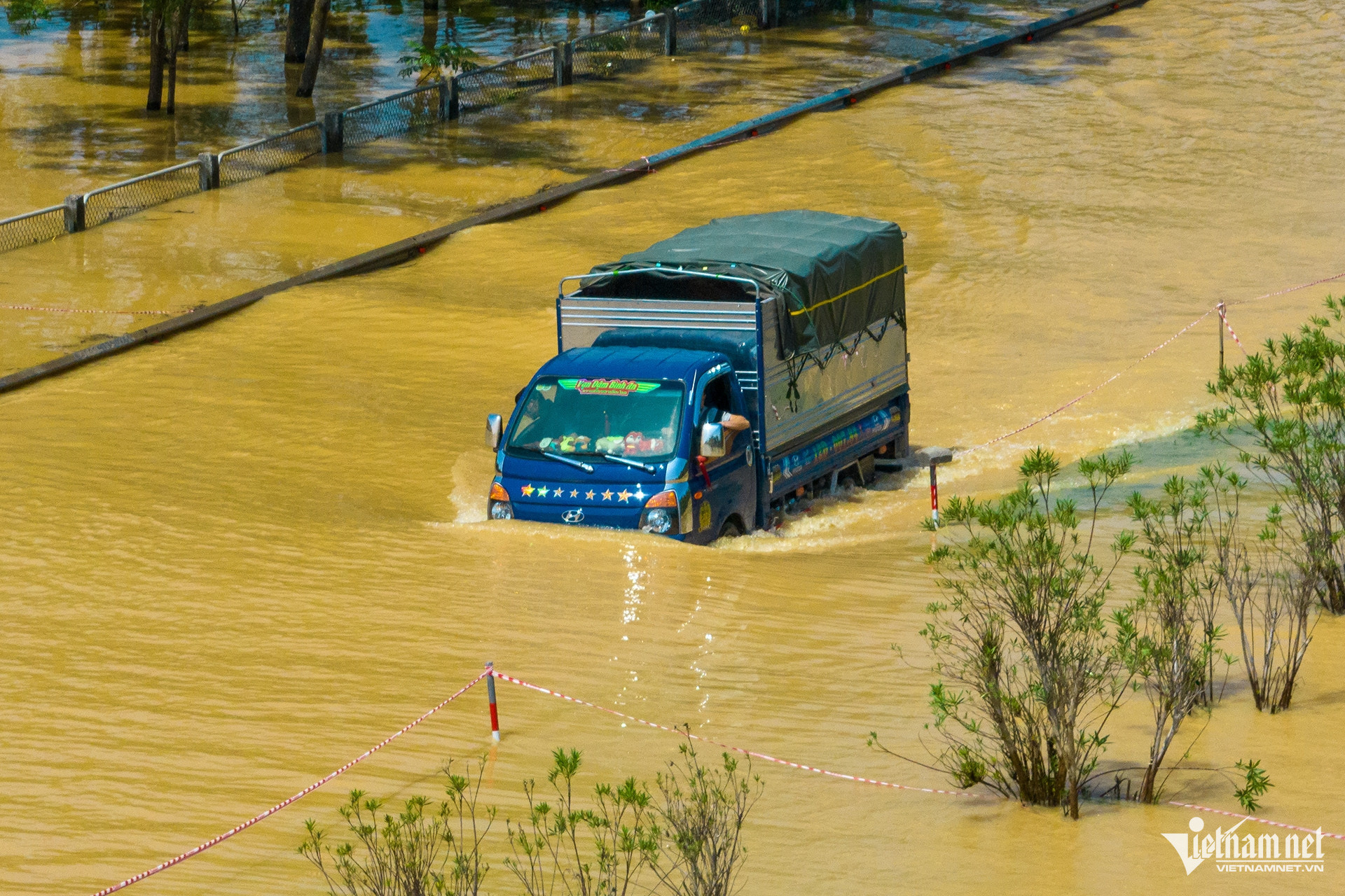 Tại điểm ngập sâu nhất, nước đã dâng quá bánh xe ô tô, biến con đường thành sông.