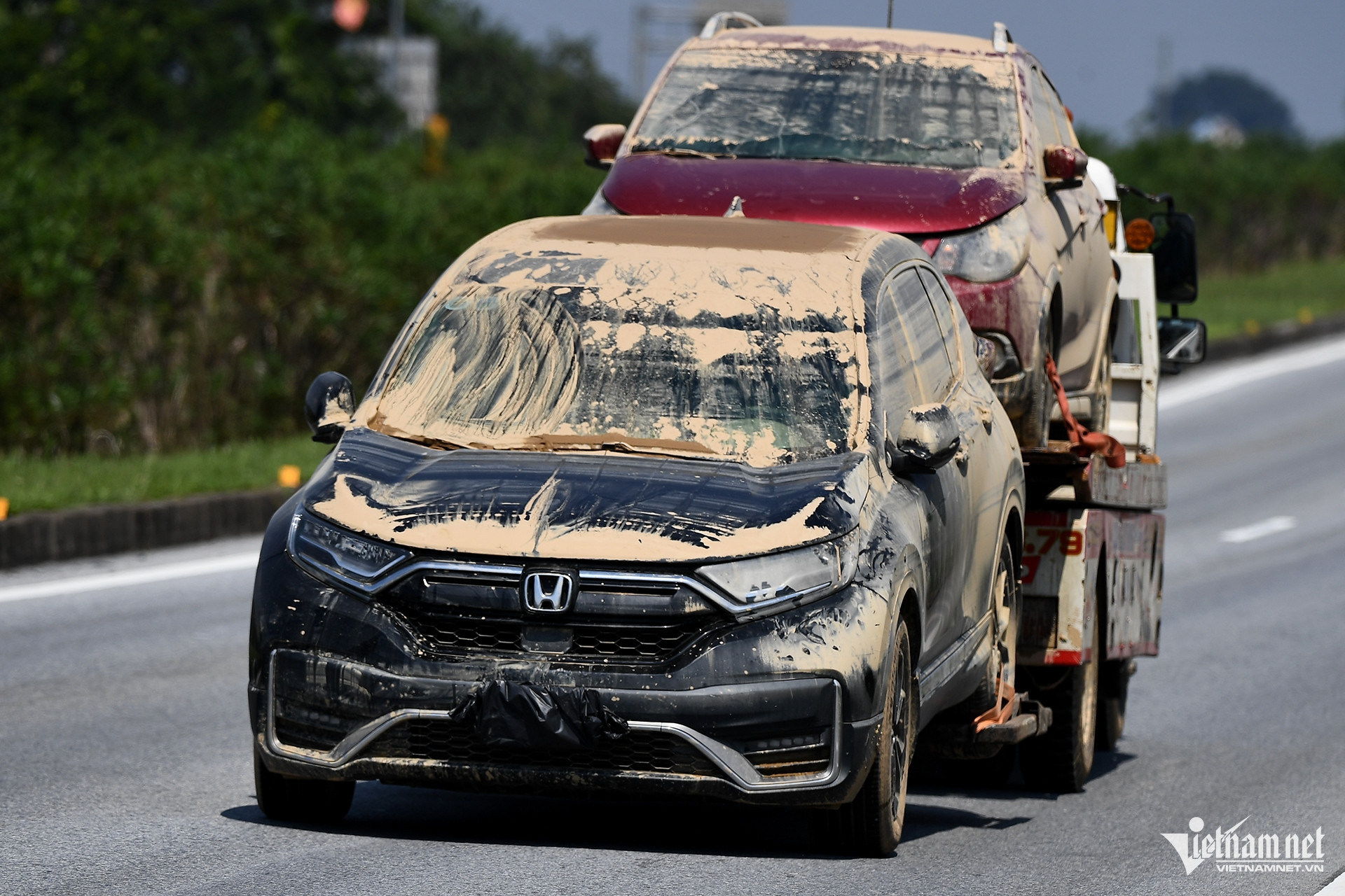 Tại các đoạn khô ráo, từng chiếc xe cứu hộ kéo ô tô phủ đầy bùn đất băng băng trên cao tốc.