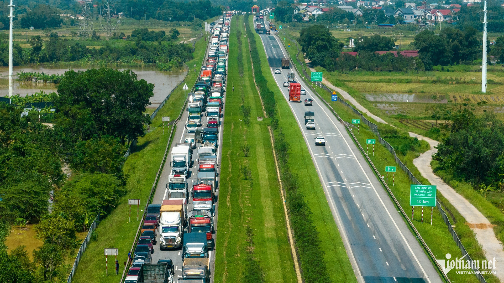 Cao tốc hướng về Thủ đô bị ùn tắc dài nhiều km. Nhiều người từ Thái Nguyên vẫn chưa thể tới Hà Nội kể từ ngày 9/10.