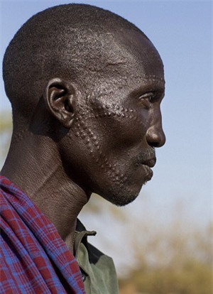 Một người thuộc bộ lạc Toposa với chi chít vết xăm.