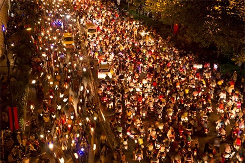 23h đường Hàm Nghi, Tôn Đức Thắng, Đại lộ Võ Văn Kiệt (đoạn quận 1) giao thông ngưng trệ do hàng vạn người đổ về trung tâm Sài Gòn để chờ bữa tiệc ánh sáng, khiến không gian nơi đây trở nên ngột ngạt.