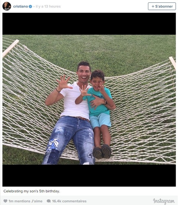 Hai bố con Ronaldo ngồi trên chiếc võng trong vườn nhà, giơ 5 ngón tay để chào mừng sinh nhật của Cristiano Jr. Bức ảnh đã nhận được tới hơn 1 triệu “like” và hàng chục ngàn lời chúc tốt đẹp của người hâm mộ được gửi tới cậu bé.