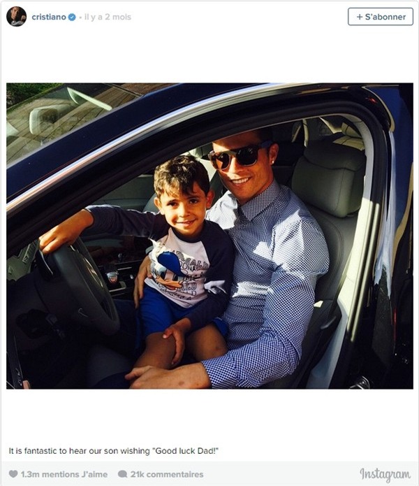 “Thật tuyệt vời mỗi khi nghe được lời “Chúc cha may mắn” từ con trai”- Ronaldo từng chia sẻ tấm hình ngồi cùng cậu nhóc Cristiano Jr trên chiếc siêu xe. CR7 cũng thường xuyên đưa con trai tới các sự kiện thể thao và chưa ai quên hình ảnh cậu nhóc bảnh bao khi theo cha tham dự đêm Gala trao giải Quả bóng vàng hồi tháng 1 vừa qua.