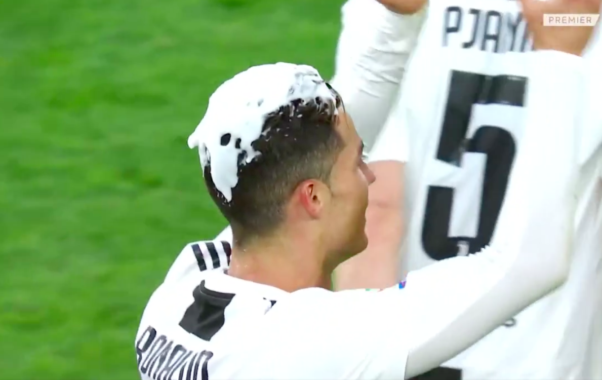Tập thể Juventus đã có màn ăn mừng danh hiệu vô địch Italy thứ 8 liên tiếp. Ronaldo là một trong những người bị xịt bọt trắng lên đầu.