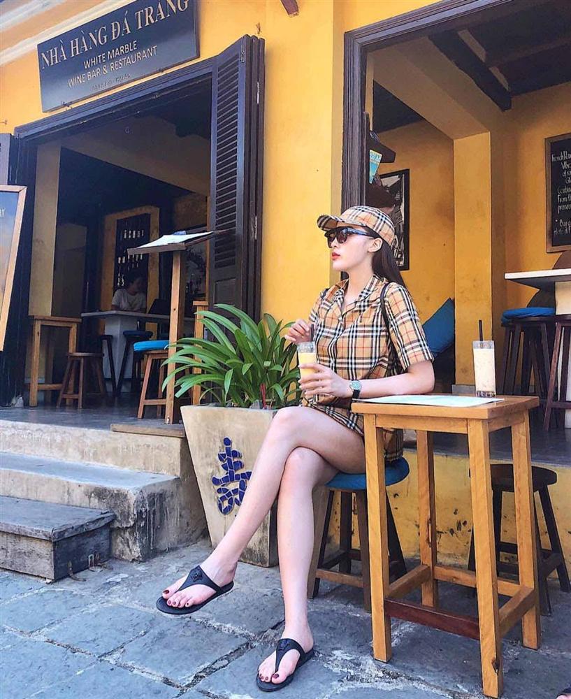 Trong chuyến du lịch Hội An của mình, người đẹp gây chú ý khi mặc set đồ từ thương hiệu Burberry với mũ và áo có giá khoảng hơn 14 triệu.