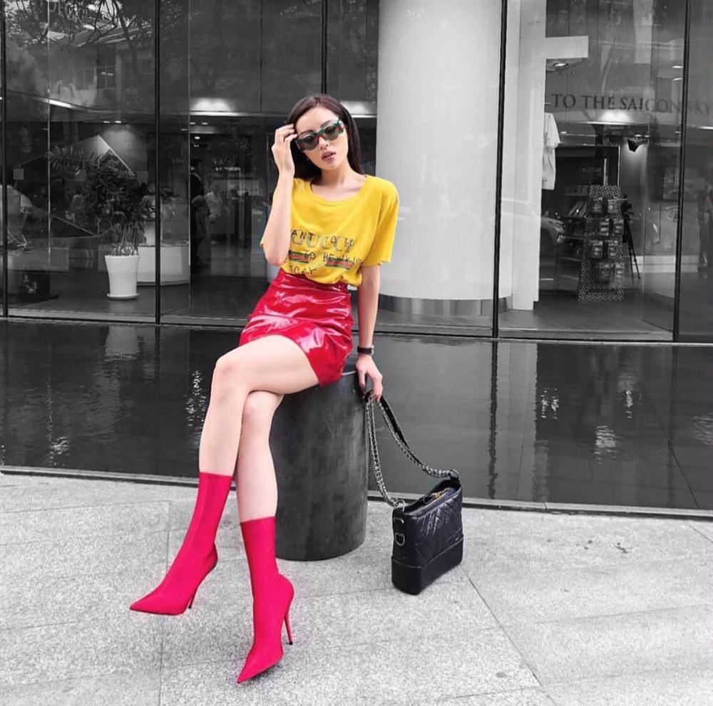 Vốn chỉ quen với những gam màu trầm hoặc màu trắng, Kỳ Duyên khiến nhiều người bất ngờ với set đồ nổi bật và vô cùng sặc sỡ. Đôi boots màu đỏ của cô nàng đến từ thương hiệu Balenciga với giá 23 triệu đồng. Chiếc túi xách Chanel Gabrielle, món đồ yêu thích của Kỳ Duyên có giá 98 triệu đồng.