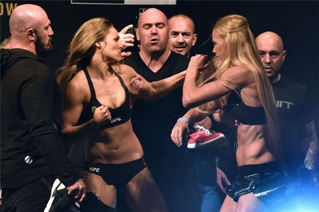 Sau khi kết thúc phần kiểm tra của mình, Rousey đã tiến lại gần nhau để chụp ảnh theo thông lệ với một thái độ đầy thách thức. Bất ngờ thay, Holm đã đáp lại bằng việc tung cú đấm vào mặt Rousey, dẫn đến một vụ xô xát nhỏ ngay trên khán đài.