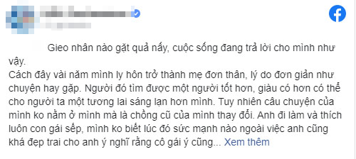 Cách đây ít hôm mình nghe được tin cô gái kia kết hôn nhưng chú rể lại không phải là anh, nghe nói sau khi chia tay mình anh theo đuổi người ta quyết liệt tuy nhiên chỉ sau vài tháng thì cũng chia tay. Hóa ra cô gái kia là con nhà giàu, sống ở nước ngoài từ nhỏ và thuộc dạng tay chơi, thay người yêu như thay áo. Cô ý kết hôn với một chàng trai trẻ môn đăng hộ đối, anh bỏ vợ bỏ con để chạy theo tiền tài danh vọng để rồi chính anh lại trở thành trò chơi trong cái vòng quay đó. Mình không hả hê vì thấy chồng cũ bị như vậy, chỉ thấy giác ngộ một điều rằng, hôm nay chúng ta làm điều gì, mai chúng ta sẽ nhận lại những thứ như vậy”.