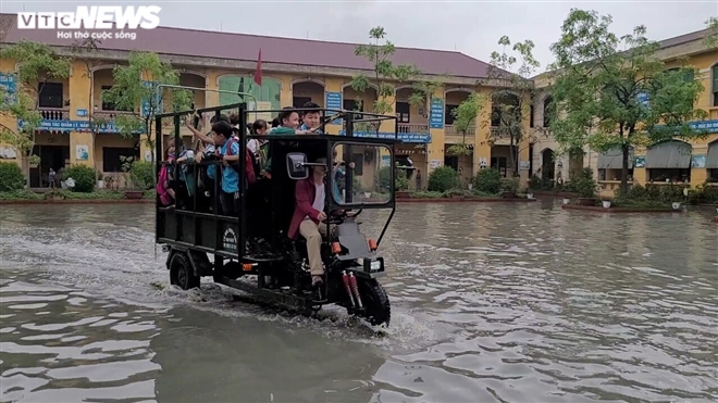 Nước ngập sâu khiến phụ huynh phải lấy phương tiện chuyên chở hàng để đưa đón học sinh.