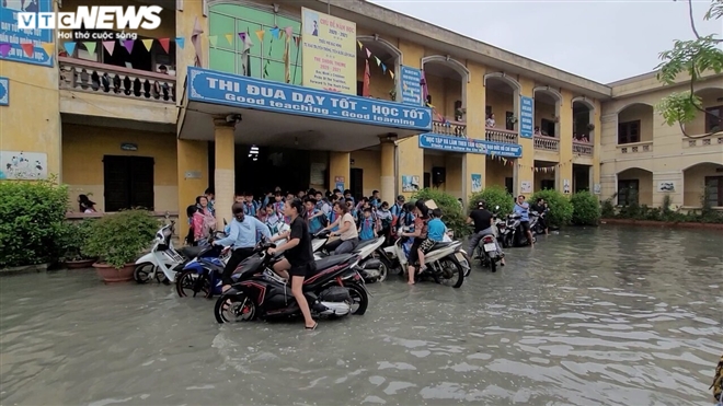 "Trong thời gian vừa rồi, do thời tiết mưa, một số các hộ chưa dừng sản xuất và nước trong khu dân cư dồn về nên từ buổi chiều qua có hiện tượng nước dâng lên, tràn vào một phần sân trường cấp 1 và cấp 2 của địa phương", ông Tấn nói.