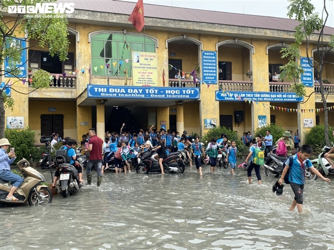 Học sinh phải lội qua biển nước để trở về nhà sau giờ tan học.
