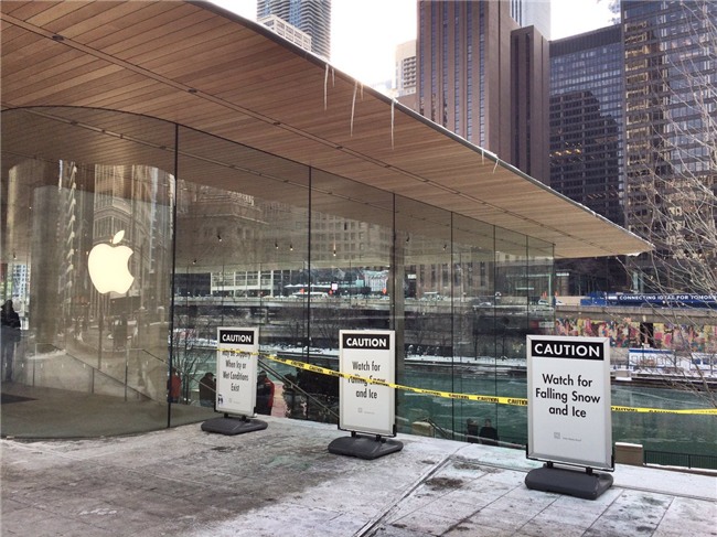 Nói cách khác, nếu đen đủi thì Apple đang gián tiếp "dọa" fan hâm mộ sợ chạy mất mỗi khi đi đến gần phần rìa mái của mình. Có lẽ các nhà thiết kế đã bỏ qua hệ thống thoát nước riêng trên mái chăng, rồi lại làm nó hơi dốc nữa nên để nước chảy xuống và đóng băng dần đến như vậy.