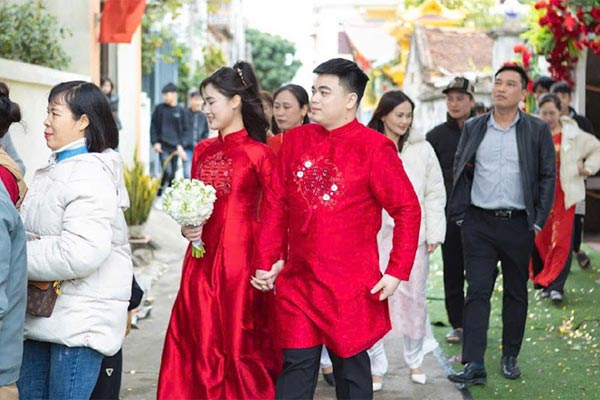 Cô dâu của Thọ là Nguyễn Bích. Cặp đôi sinh ra và lớn lên cùng xóm, hai chiếc cổng cưới gần như nằm đối diện nhau.
