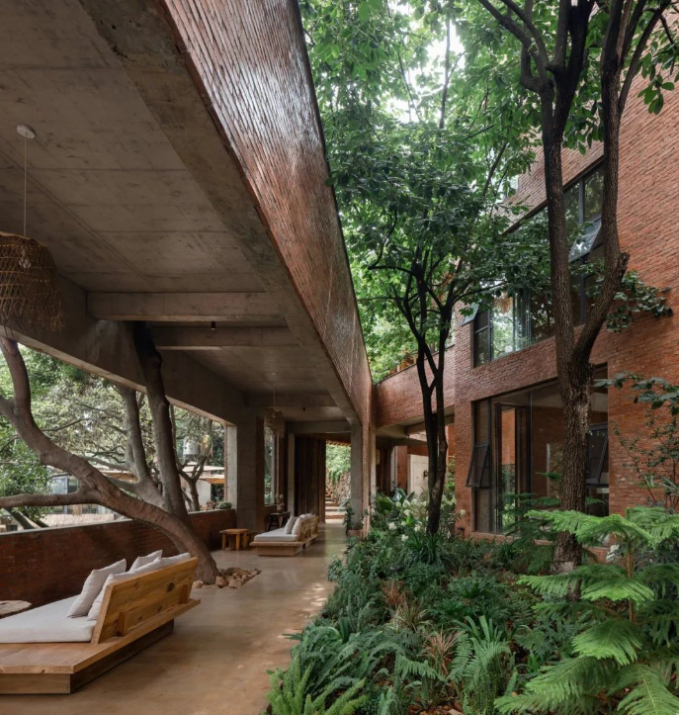 Thiết kế của căn nhà 2 tầng gây ấn tượng bởi không gian mở vô cùng thoáng đãng. Tầng 1 là khu vực phòng khách để tiếp đón bạn bè và hàng xóm. Tầng 2 là không gian ngủ nghỉ riêng tư của các thành viên trong gia đình. Vì được xây bằng gạch đỏ nên căn nhà vẫn mang lại cho các thành viên cảm giác gần gũi, mộc mạc và vô cùng dễ chịu.