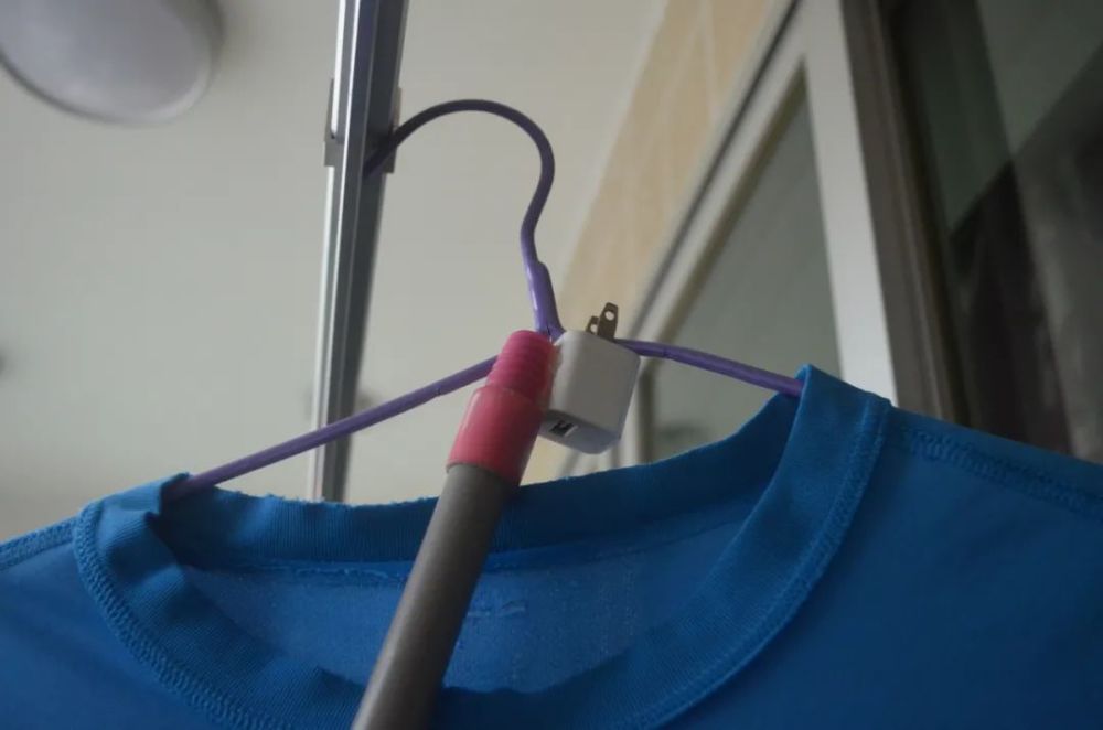 Sau đó chuẩn bị một chiếc gậy, có thể làm từ cán chổi hoặc cây lau nhà cũ. Tiếp theo, bạn phết một ít keo nến nóng chảy vào mặt bên của đầu sạc điện thoại cũ và dán vào đầu của cây gậy. Như vậy là đã hoàn thành một chiếc nĩa phơi quần áo đơn giản và thiết thực. Khi cần phơi quần áo, chúng ta chỉ cần móc mắc áo vào giữa lỗ cắm của đầu sạc và đưa lên một cách nhẹ nhàng, rất tiện lợi.