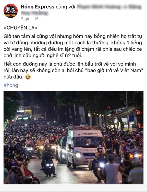 Giờ tan tầm, Sài Gòn luôn đông nghẹt với "đặc sản" là xe cộ, là những tiếng òi inh ỏi suốt đoạn đường về. Ai cũng vội để về nhà sau một ngày quần quật với guồng quay cuộc sống. Nhưng hôm nay, mọi thứ bỗng nhiên trật tự lạ thường. Hàng nghìn người nối đuôi nhau song không hề hỗn loạn, lặng lẽ theo sau chiếc xe chở thi hài cố nghệ sĩ Chí Tài ra sân bay Tân Sơn Nhất. Người người dạt sang hai bên đường, nhường cho một chiếc xe tang chạy thẳng một hàng. Bên trong chiếc xe ấy là linh cữu của cố danh hài Chí Tài, người nghệ sĩ vừa qua đời đột ngột 4 ngày trước.