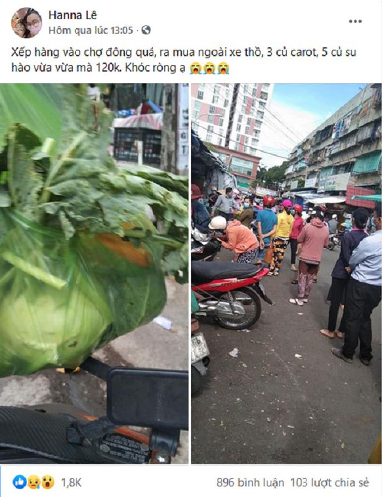 “3 củ cà rốt, 5 củ su hào vừa vừa mà 120.000 đồng. Khóc ròng”, một người nội chợ khác chia sẻ lên mạng xã hội.