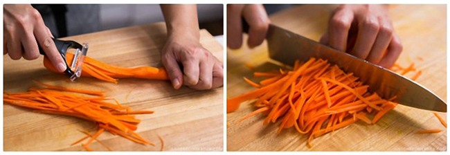 Gọt bỏ vỏ cà rốt sau đó thái sợi mỏng nhỏ như hình.