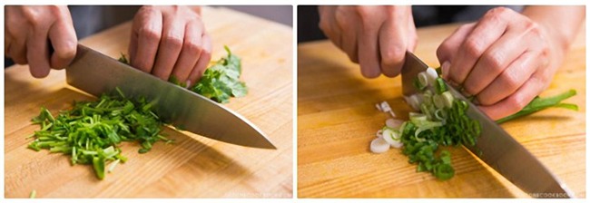 Tiếp đến thái rối ngò và thái nhuyễn hành lá.