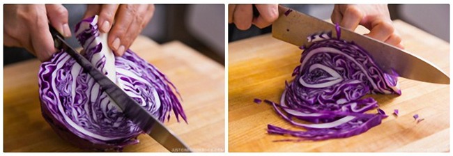 Bắp cải tím bỏ phần cồi bên trong rồi cắt thành dạng sợi nhỏ. Tương tự thực hiện với bắp cải trắng.