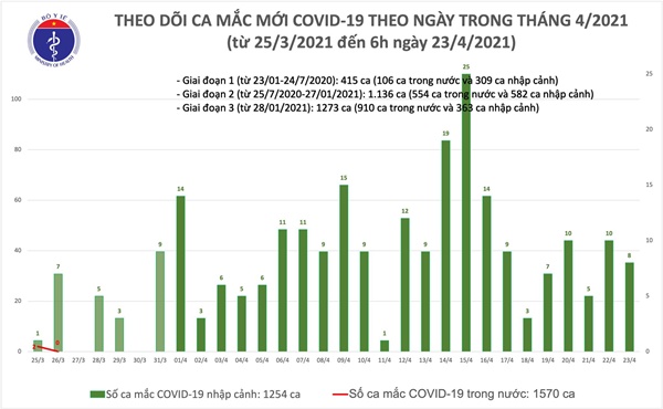 - Tính đến 6h ngày 23/4: Việt Nam có tổng cộng 1570 ca mắc COVID-19 do lây nhiễm trong nước, trong đó số lượng ca mắc mới tính từ ngày 27/1 đến nay: 910 ca, riêng Hải Dương có 726 ca, Quảng Ninh (61 ca), Gia Lai (27 ca), Hà Nội (34 ca), Bắc Ninh (5 ca), Bắc Giang (2 ca), TP. Hồ Chí Minh (36 ca ), Hoà Bình (2 ca), Hà Giang (1 ca), Điện Biên (3 ca), Bình Dương (6 ca), Hải Phòng (4 ca ), Hưng Yên (3 ca).