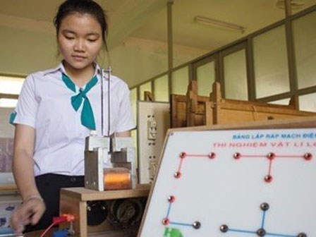Nữ sinh Nguyễn Việt Trinh (học sinh lớp 11A3, trường THPT Krông Nô, huyện Krông Nô, Đắk Nông) sáng chế phanh điện từ nhằm hạn chế tình trạng mất phanh mỗi khi đi đèo.