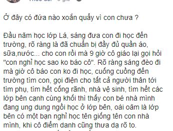 Quá bất ngờ và hoảng sợ, chị G.N.T cuống cuồng đến trường tìm con, gọi điện cho tất cả người thân đến tìm phụ, tìm hết mọi cống rãnh, đến nhà vệ sinh. Cuối cùng, gia đình chị tìm cả các lớp bên cạnh và phát hiện con gái mình đang ung dung... ngồi học ở lớp bên.