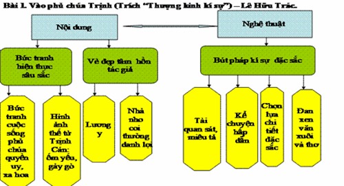 Ví dụ, đối với phần Tổng kết bài “Vào phủ chúa Trịnh”, giáo viên đưa ra sơ đồ sau và yêu cầu học sinh hoàn thành sơ đồ trong vòng 2 phút. Sau đó giáo viên trình chiếu đáp án, học sinh tự chữa vào vở.