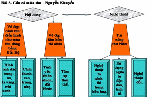Ví dụ: Đối với phần Tổng kết bài học “Câu cá mùa thu”, giáo viên đưa ra sơ đồ sau (bao gồm các ý lớn, bỏ trống toàn bộ ý nhỏ) và yêu cầu học sinh hoàn thành sơ đồ trong vòng 2 phút. Giáo viên trình chiếu đáp án, học sinh tự sửa và bổ sung: