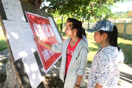 Thí sinh xem số báo danh, sơ đồ phòng thi tại điểm thi trường THPT Anh Sơn 2 (Nghệ An). |