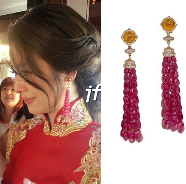 Chỉ đôi hoa tai người đẹp dùng trong lễ đón dâu cũng thuộc thương hiệu Bvlgari thuộc bộ sưu tập Color Treasures gắn ngọc thạch lựu hồng, ruby và kim cương với giá khoảng 10 triệu NDT (34 tỉ đồng)