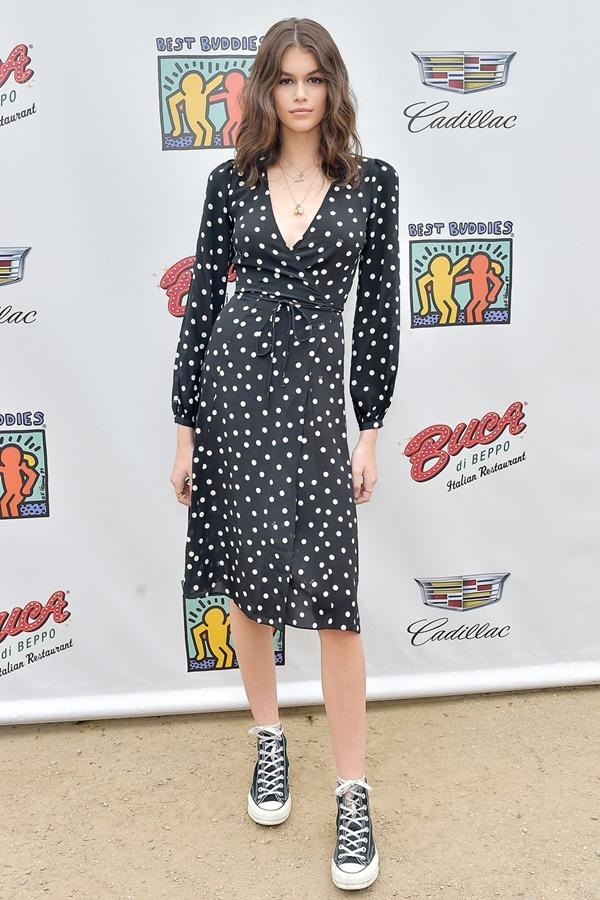 Kaia Gerber gợi ý cho cô nàng bánh bèo với thiết kế váy cuốn mỏng nhẹ của Réalisation Par mix cùng giày Converse năng động.