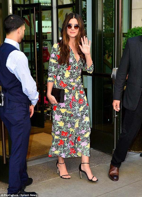 Loại vải chiffon, voan mỏng nhẹ là chất liệu phổ biến của trang phục dạo phố được các tín đồ thời trang yêu thích. Chúng tạo cảm giác mát mẻ, đồng thời tăng vẻ nữ tính. Nữ diễn viên Sandra Bullock cũng lựa chọn phong cách này khi diện chiếc váy của Elie Saad với cách phối họa tiết ấn tượng giữa chấm bi và hoa nhiều màu sắc.